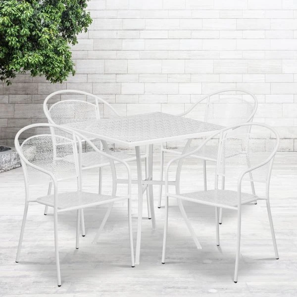 Oia Commercial Grade 28″ Square White Indoor-Outdoor Steel Patio Table Set with 4 Round Back Chairs – Brighten up your patio space with this beautiful patio table set. This colorful set will enhance your bistro, cafe, restaurant, hotel or home patio space. The patio chairs stack for storing. The frames are designed for all-weather use making it a great option for indoor and outdoor settings. For longevity, care should be taken to protect from long periods of wet weather. The possibilities are endless with the multitude of environments in which you can use this table, for both commercial and residential spaces.