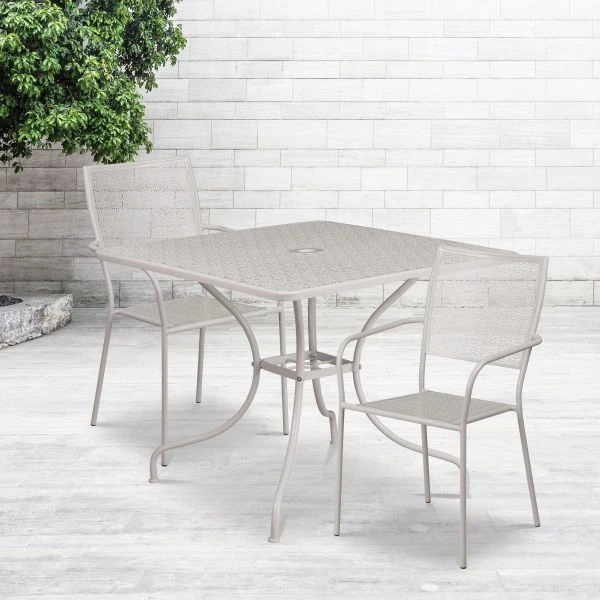 Oia Commercial Grade 35.5″ Square Light Gray Indoor-Outdoor Steel Patio Table Set with 2 Square Back Chairs – Brighten up your patio space with this beautiful patio table set. This colorful set will enhance your bistro, cafe, restaurant, hotel or home patio space. The top includes an umbrella hole (umbrella not included). The patio chairs stack for storing. The frames are designed for all-weather use making it a great option for indoor and outdoor settings. For longevity, care should be taken to protect from long periods of wet weather. The possibilities are endless with the multitude of environments in which you can use this table, for both commercial and residential spaces.