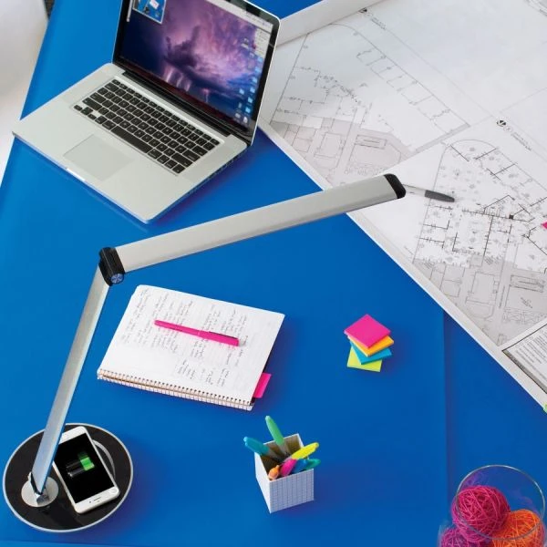 OttLite Desk Lamp – Take your work space to a new, healthier level with the Elevate Desk Lamp. Exclusive, ClearSun LED technology brings the benefits of natural daylight indoors to reduce eyestrain, improve productivity and alertness and increase your satisfaction. Streamlined, adjustable design lets you have complete lighting control using the sliding touch dimmer to choose the brightness level. Memory feature recalls the last brightness setting for personalized use. Light illuminates a desired area with a color rendering index of 97 with a maximum output of 445 lumens. Space-saving, folding arm is height-adjustable from 10″ to 26″. Charge your Qi-compatible phone on the wireless charging pad. Simultaneously charge another device using the 5V, 2.1A USB port and the convenient, 16″ charging cord.