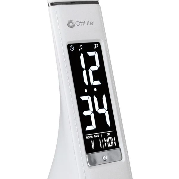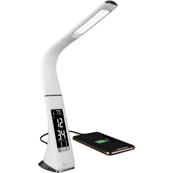 OttLite Thrive LED Desk Lamp with Clock and Sanitizing – OttLite brings the eyestrain-reducing power of ClearSun LED technology together with the sanitizing power of Visible Light Disinfection to provide the ultimate healthy light. Simply turn on this Thrive LED Desk Lamp with Clock to begin sanitizing your space against potentially harmful bacteria, mold and fungi. Super-flexible silicon neck lets you direct light right where you need it. This flexible lamp adjusts from 10″ to 18-3/4″ and features an LCD that displays date, time and ambient temperature. Plus, the built-in USB charging port keeps your devices charged. Plastic desk lamp also features chrome accents and textured head and base with stitching detail. Base measures 2.65″ x 3.625″.
