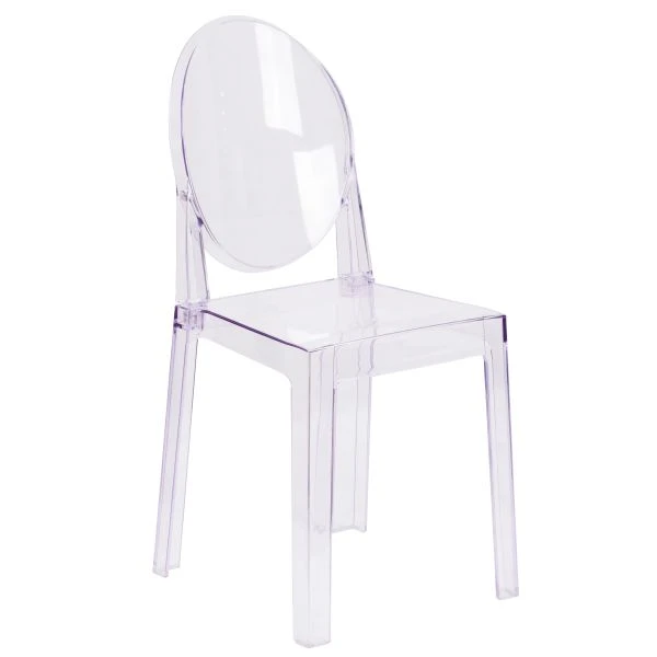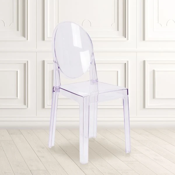 Revna Ghost Chair with Oval Back in Revna Transparent Crystal – If you are searching for unique seating for your dining room, cafe or event venue your quest is over. This clear ghost chair will bring modern design, elegance and function to your home, restaurant and special events. This modern chair with its Louis XVI styling and near invisibility highlights your artwork and other furniture, lightens a crowded space and can make a small room appear larger. A contoured seat makes this chair comfortable and its polycarbonate molded structure makes it shock, scratch and water resistant. Protective floor glides protect your floor by sliding smoothly when you need to move these beautiful chairs. Designed for indoor-outdoor and commercial use, the understated ghost chair is a classic accent chair that highlights almost any decor without blocking the view.