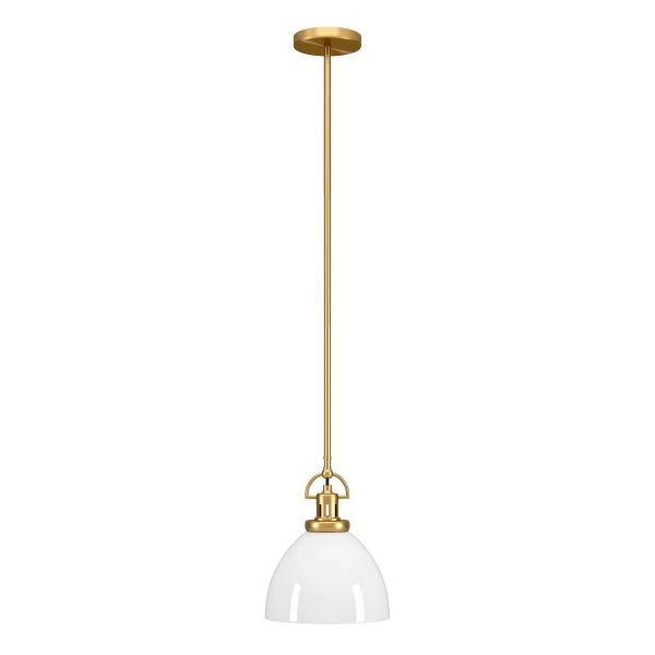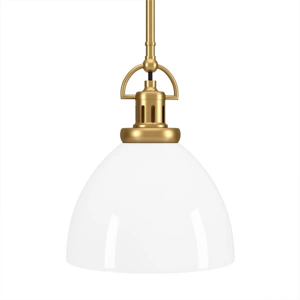 Rockwell 9.5″ Wide Pendant with Glass Shade in Brass/White Milk – Illuminate your kitchen, entryway or dining room table with this vintage-inspired pendant light. Featuring keyhole detailing and a classic dome-shaped glass shade, this hanging light is equally at home in a modern farmhouse kitchen or a contemporary dining room. The 8 foot adjustable cord lets you customize this fixture to fit your space perfectly.