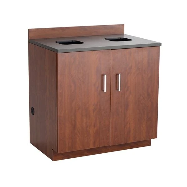 Safco Hospitality Base Cabinet, Waste Receptacle – Hospitality Cabinets feature a modular design with ¾” thermal fused, scratch resistant melamine laminate cabinets. The cabinets are designed for waste management. Doors feature adjustable soft-close chrome-plated European hinge and 2mm PVC edgeband. Individual cabinets attach securely together with metal connector pins. Appliance hutch design allows installation with any base cabinet. Color-matched exterior and interior.