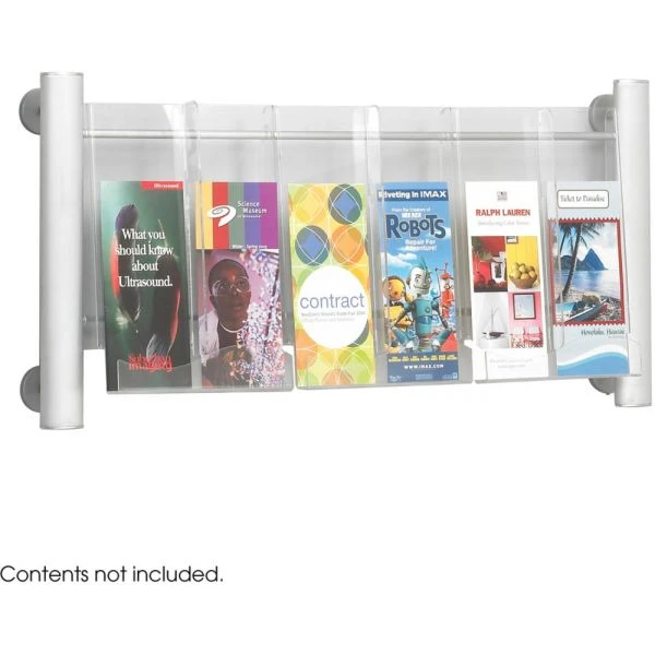 Safco Luxe Magazine Rack, 3 Compartments, 31.75w x 5d x 15.25h, Clear/Silver – Sleek designed display with silver-coated, brushed aluminum frame and clear acrylic pockets. Wall-mounted and floor-standing racks have center dividers that allow for pockets to be sized for magazines or pamphlets.