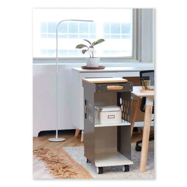 Safco Resi LED Floor Lamp, Gooseneck, 60″ Tall, White, Ships in 1-3 Business Days – Illuminate your space efficiently with the easy-to-assemble Resi Gooseneck LED Floor Lamp. This versatile lamp features a head that rotates 45 degrees left or right and a gooseneck design that’s flexible 360 degrees. LED lighting and a nine-hour shut off delay saves energy if you forget to turn the lamp off when you leave for the day. Select color temperature or dimmable modes with the simple press of a button.