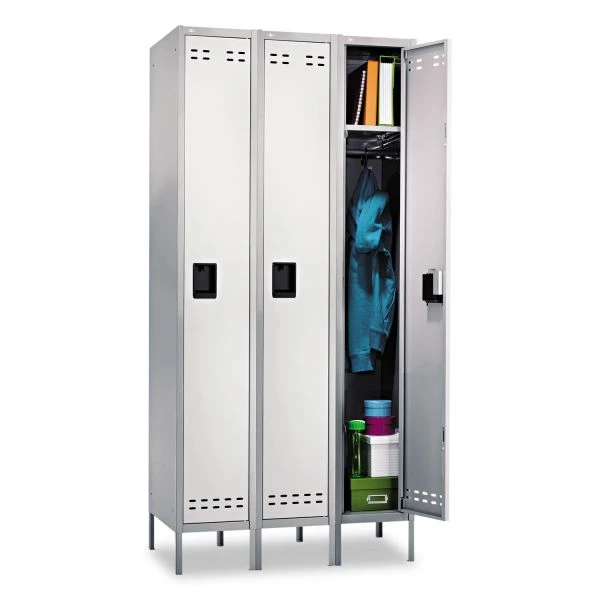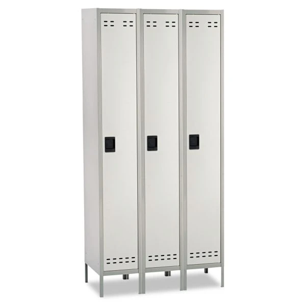 Safco Single-Tier, Three-Column Locker, 36w x 18d x 78h, Two-Tone Gray – Single-tier, two-tone lockers feature legs and a strong, one-piece design with heavy-gauge, all-steel construction. Use as a stand-alone or link with other lockers. Set of lockers includes three compartments with ventilation slits. Recessed handle with padlock provision has no protruding parts.