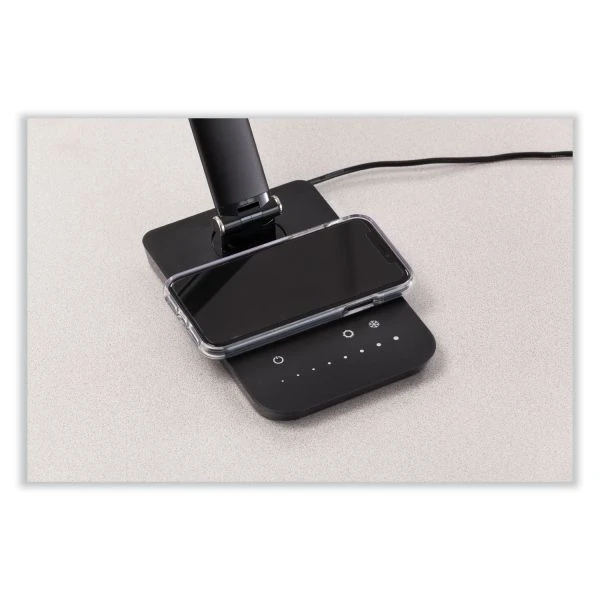 Safco Vamp LED Wireless Charging Lamp, Multi-pivot Neck, 16.75″ High, Black, Ships in 1-3 Business Days – Vamp LED lighting offers flicker-free, energy-saving, economical lighting choices that can be easily customized to fit personal preferences. This versatile unit also comes with a quick and easy, built-in wireless charging pad. Featuring four different temperature settings with both warm light (sun icon) and cool light (snowflake icon) available. It also includes a touch-free dimmer switch to adjust the brightness with a memory button to recall the last setting. Swipe/tap to adjust the brightness. This allows the user to find the lighting that suits them best, which may help to lessen eye strain and create a more comfortable working environment. The flexible multi-pivot neck makes it easy to adjust the angle of the lighting as needed. The lamp also has a USB port on the back of the base, allowing for convenient charging capabilities for other electronics. For desk, home office use or other spaces where extra light is needed.