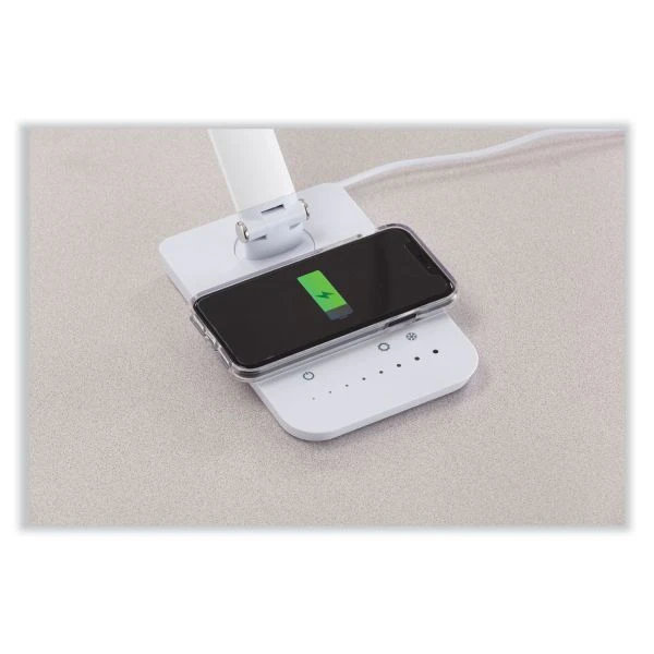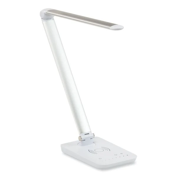Safco Vamp LED Wireless Charging Lamp, Multi-pivot Neck, 16.75″ High, Silver, Ships in 1-3 Business Days – Vamp LED lighting offers flicker-free, energy-saving, economical lighting choices that can be easily customized to fit personal preferences. This versatile unit also comes with a quick and easy, built-in wireless charging pad. Featuring four different temperature settings with both warm light (sun icon) and cool light (snowflake icon) available. It also includes a touch-free dimmer switch to adjust the brightness with a memory button to recall the last setting. Swipe/tap to adjust the brightness. This allows the user to find the lighting that suits them best, which may help to lessen eye strain and create a more comfortable working environment. The flexible multi-pivot neck makes it easy to adjust the angle of the lighting as needed. The lamp also has a USB port on the back of the base, allowing for convenient charging capabilities for other electronics. For desk, home office use or other spaces where extra light is needed.