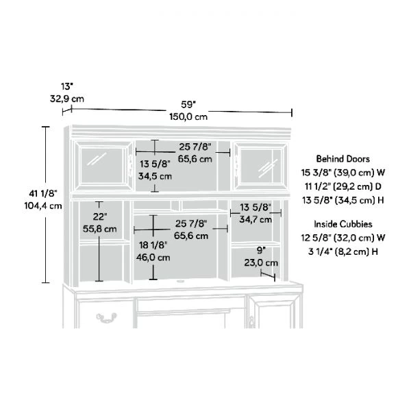 - Hutch measures 41-1/8″H x 59″W x 13″D.
