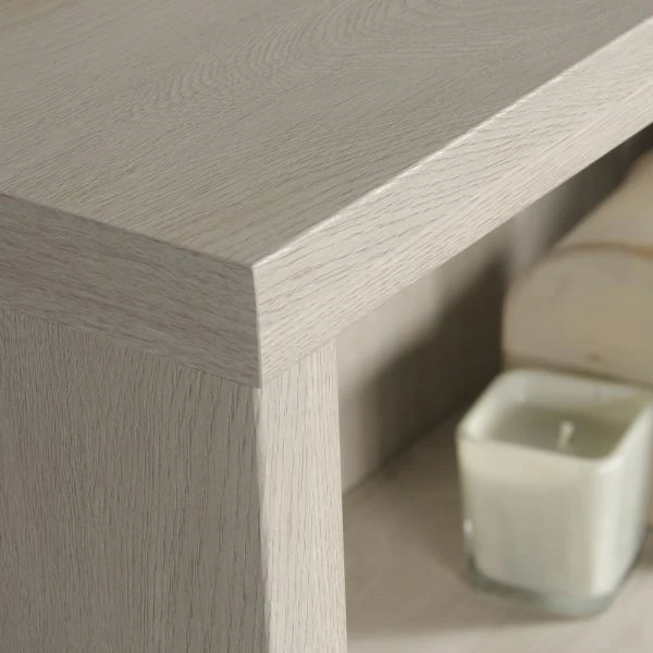 - Engineered wood construction with a laminate finish features a wide panel wrap design for less deflection in the shelves.