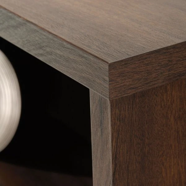 - Engineered wood construction with a laminate finish features a wide panel wrap design for less deflection in the shelves.