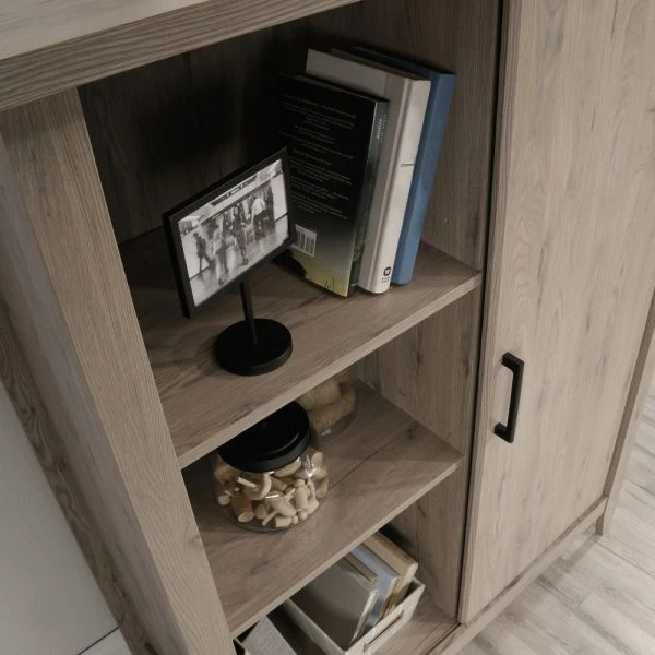 Sauder Summit Station 52″H Bookcase With Sliding Door, Laurel Oak – Help organize books, electronics and other accessories with help from this Sauder Summit Station Bookcase. The bookcase is made of durable engineered wood and features sleek metal hardware. The door slides to reveal 3 interior shelves for separate storage spaces.