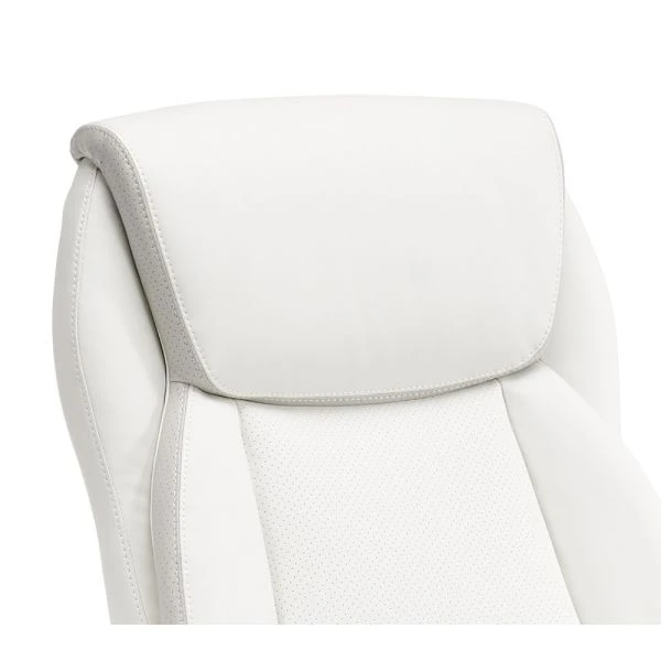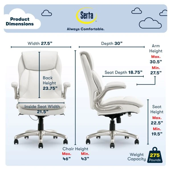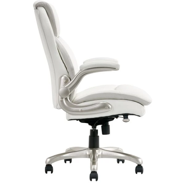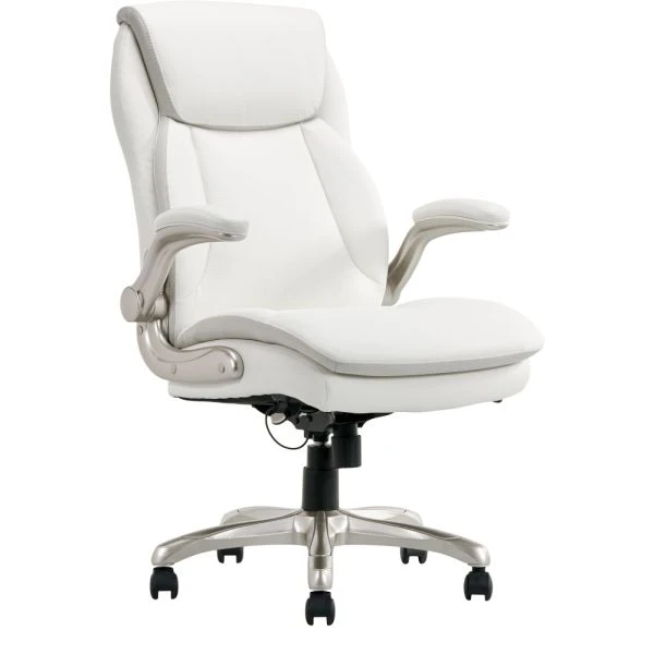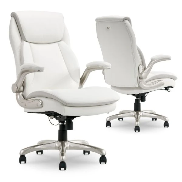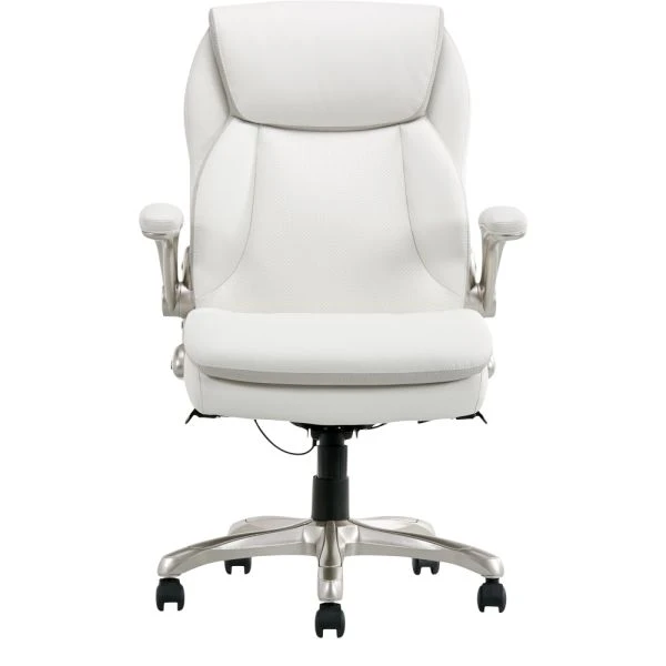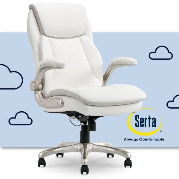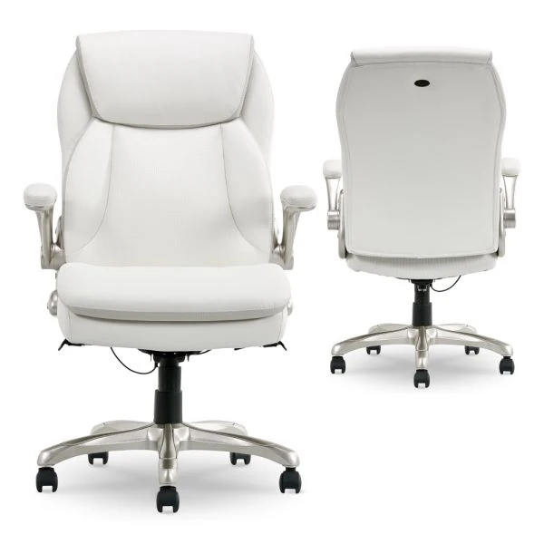 Serta Smart Layers Brinkley Ergonomic Bonded Leather High-Back Executive Chair, White/Silver – It’s about balance in the workplace nowadays—and the Serta Smart Layers Brinkley Executive Chair brings that and more. With a perfect mix of comfort and performance, this Serta office chair features 5 layers of foam with individually wrapped ComfortCoils for pressure point relief and temperature control during extended use. An ergonomic design with lumbar support and a waterfall seat cushion mean this high-back chair provides all-day comfort. Because when the job’s not cushy, the chair better be.