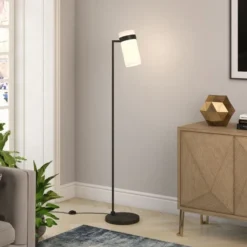 Markos Tilted Floor Lamp With Fabric Shade In Blackened Bronze/White