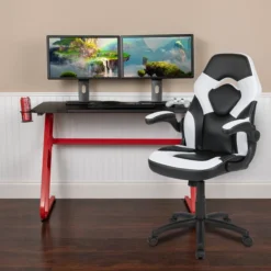 Optis Red Gaming Desk And White/Black Racing Chair Set With Cup Holder And Headphone Hook