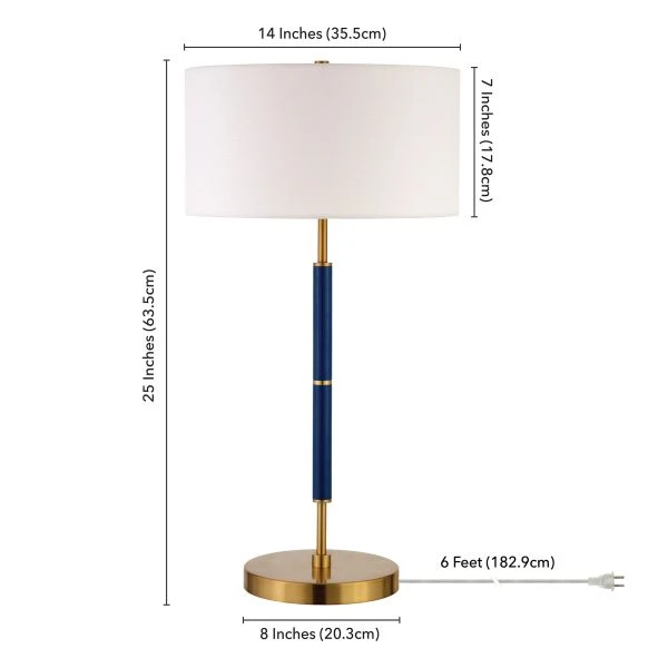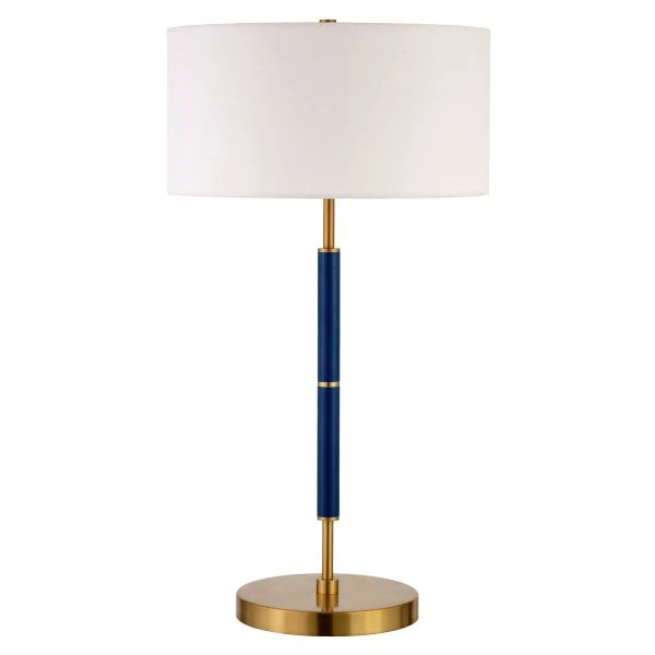 Simone 25″ Tall 2-Light Table Lamp with Fabric Shade in Blue/Brass/White – Add visual interest to any room with this two-toned contemporary table lamp. On-trend neutral colors are perfectly paired with lustrous metallic accents to elevate your design scheme. Its generous French drum shade holds space for two bulbs to cast extra light wherever its needed.