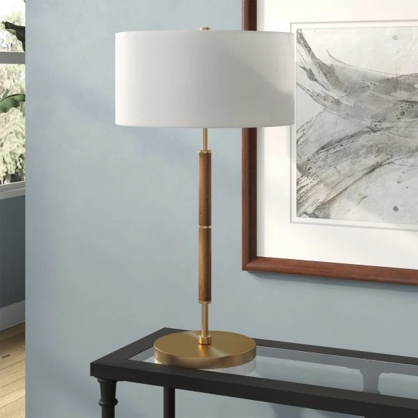 Simone 25″ Tall 2-Light Table Lamp with Fabric Shade in Rustic Oak/Brass/White – Add visual interest to any room with this two-toned contemporary table lamp. On-trend neutral colors are perfectly paired with lustrous metallic accents to elevate your design scheme. Its generous French drum shade holds space for two bulbs to cast extra light wherever its needed.