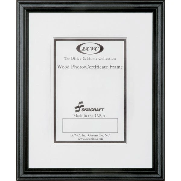SKILCRAFT Wood Poster Frame – Versatile, ready-made, Style A frame works with all decors and mounts on your wall with pre-installed hangers either vertically or horizontally. Insert your award, photo or document quickly and easily. Simplistic design includes 3/4″ black molding and smooth, black enamel finish. Molding is made in North Carolina of solid hardwood grown in the southeast United States, with three coats of water-based black paint and an additional semi high-gloss clear coat applied to prevent the finish from fading over time. Frame includes glass, reversible mat board (black or white), binder back, and staples.