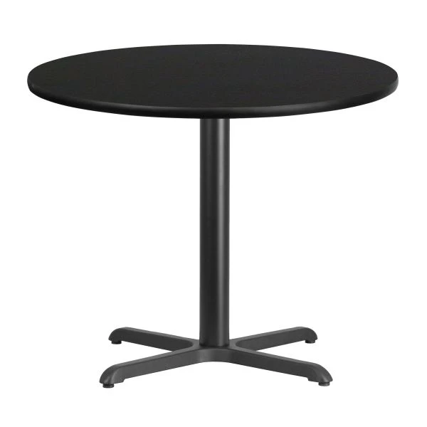 Stiles 36” Round Black Laminate Table Top with 30” x 30” Table Height Base – Complete the design of your restaurant, break room or cafeteria with this table top and base configuration. This set is designed for commercial use to withstand the daily rigors in the hospitality industry. This set will also make a great option for your home as a dining table or in the rec room. The reversible black or mahogany top allows you to make your color choice and then affix to the base. The surface is heat, scratch and moisture resistant with black protective edging. Easily clean up spills with a neutral detergent and water to keep your tables looking great. This set will be ready to use quickly wit the easy 2-piece base assembly with single bolt. The top plate is pre-welded to the column which boasts cast iron construction for strength and durability. Whether you are just starting your business or upgrading your furniture this table set will complete the look.