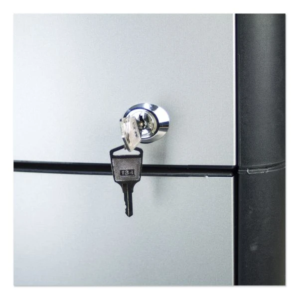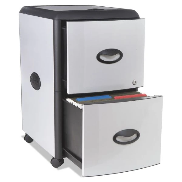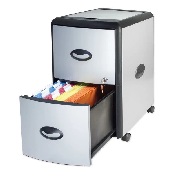 Storex Mobile Filing Cabinet with Metal Siding and Top-Drawer Organizer Tray, 2 Letter File Drawers, Silver/Black, 19″ x 15″ x 23″ – Brushed metal sides and front make this perfect for any office. Built-in rails for hanging letter size files. Label holders on front of drawers make it easy to identify contents. Easy sliding system for smooth drawer operation. Locking drawers keep contents safe and secure. Dual-purpose: can be used under worksurface or as a freestanding unit. Moves with ease from one area to another and lock in place when it has reached it’s final destination.