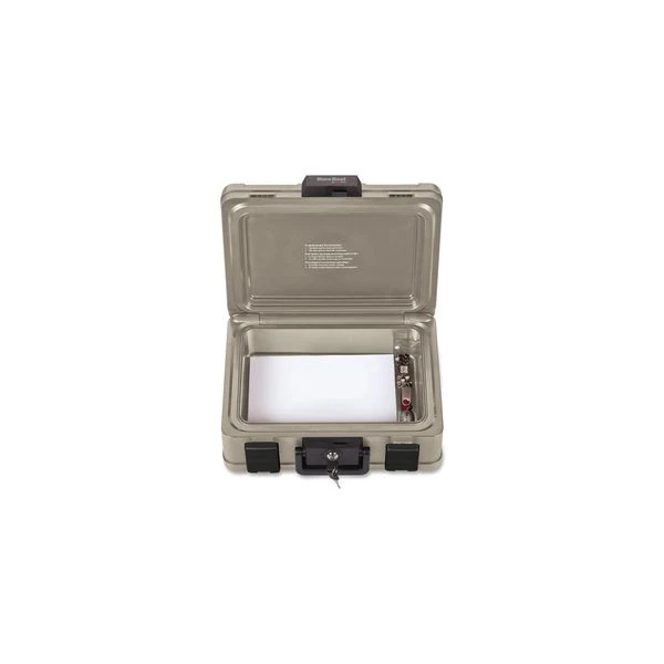 SureSeal By FireKing Fire and Waterproof Chest, 0.27 cu ft, 15.9w x 12.4d x 6.5h, Taupe – SureSeal Chest protects your important business records, documents, digital media and other valuables from fire and flood. Design is waterproof to a depth of 1 meter (39) for a minimum of 48 hours as well as UL Class 350 for 1/2 hour protection of paper documents and rated for 1/2 hour media protection to 1550 degrees for CDs, DVDs, memory sticks and USB drives. The 0.27 cubic foot capacity can hold No. 10 envelopes, folded documents, CD/DVD and flash drives and secures them with dual compression latches and a keylock.”
