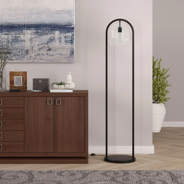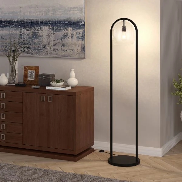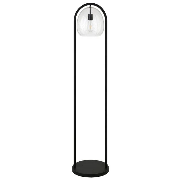 Sydney 64″ Floor Lamp with Seeded Glass Shade in Blackened Bronze – This floor lamp takes inspiration from the mid-century modern style, bringing it into the 21st century with its unique design. The large seeded glass globe shade, combined with its U-shape column base transform your standard floor lamp into a work of art. This lamps handcrafted finish and eclectic design are sure to make it the eye-catching statement piece for your living room, bedroom, reading nook and more.