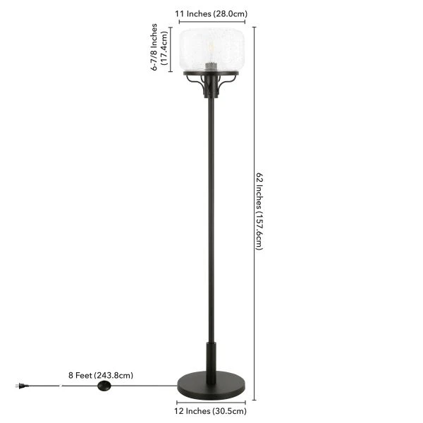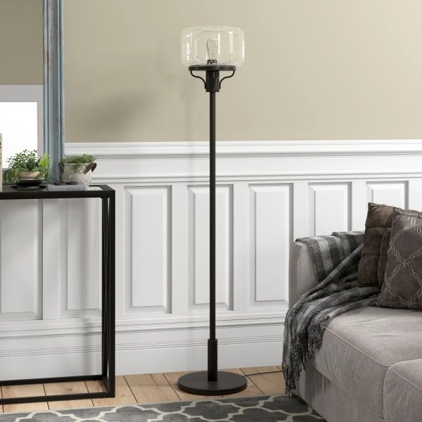 Tatum Globe & Stem Floor Lamp with Glass Shade in Blackened Bronze/Seeded – This globe and stem style floor lamp adds a playfully retro modern farmhouse vibe to your space. Reminiscent of a vintage gas station light, this fixture gets a modern update in neutral metallic finishes that perfectly offset the seeded glass shade. This 62” lamp will be a focal point in any room of your home.