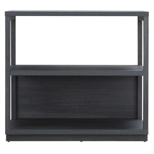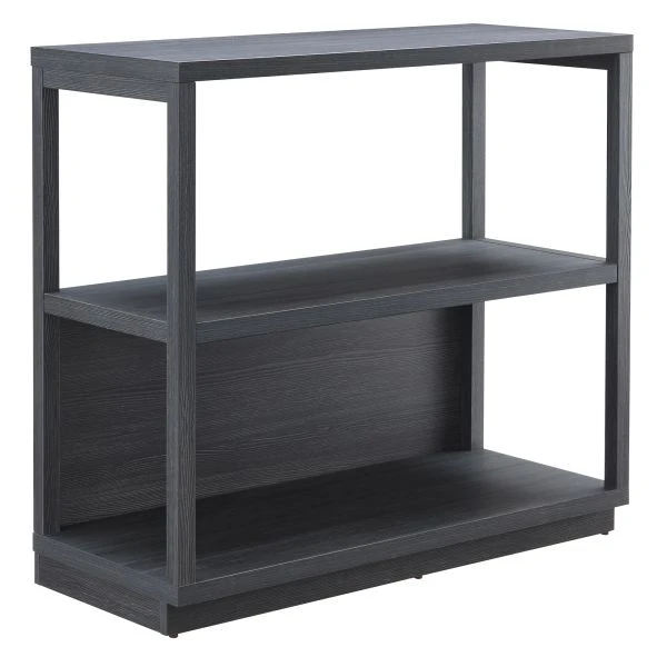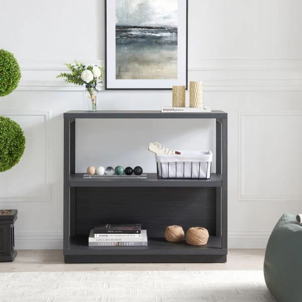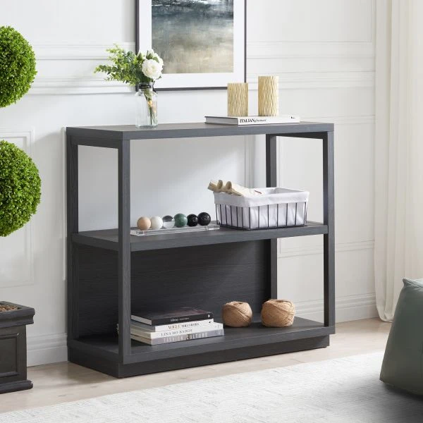 Thalia 33″ Tall Rectangular Bookcase in Charcoal Gray – Striking in its simplicity, this open plan bookcase emphasizes clean lines and straightforward design. This three-tiered storage solution features open-framed sides that create an airy exposed look, while the lower shelf’s finished back anchors the piece and creates a solid backdrop for your library. Finished in a warm wood tone, this bookcase’s compact size makes it the perfect choice for smaller spaces.