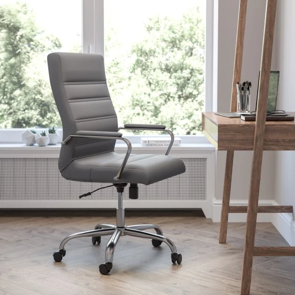Whitney High Back Gray LeatherSoft Executive Swivel Office Chair with Chrome Frame and Arms – An elegant blend of comfort and style, this high-back LeatherSoft office chair is the perfect seating solution for your workspace. Crafted from gray LeatherSoft material with chrome arms and base, the ergonomic design brings a sleek look with ample durability and support for long-term use. Designed for exceptional comfort, this LeatherSoft office chair features a cushioned seat and back upholstered in gray LeatherSoft for softness and durability. Padding on the arms lends additional comfort, while horizontal stitching along the seat and back adds a touch of refinement. The high-back office chair features extended height to support your upper back and help relieve back tension. A waterfall front seat edge removes pressure on your lower legs, to help improve circulation during long hours at your desk. Complete your custom fit with the pneumatic seat height adjustment lever and a tilt-lock mechanism for a rocking and reclining motion. Easily maneuver through a variety of tasks with the full 360-degree swivel chair motion that is ideal for shifting between your computer, phone, and more. When you need to reach things a little further away, simply roll your chair with the smooth movement of the wheeled base. A bright chrome finish adorns the frame and arms of this office desk chair, creating a sleek and timeless look. The classic gray LeatherSoft pairs effortlessly with any office decor style, creating a comfortable and elegant impression that’s perfect for residential or corporate workspaces.